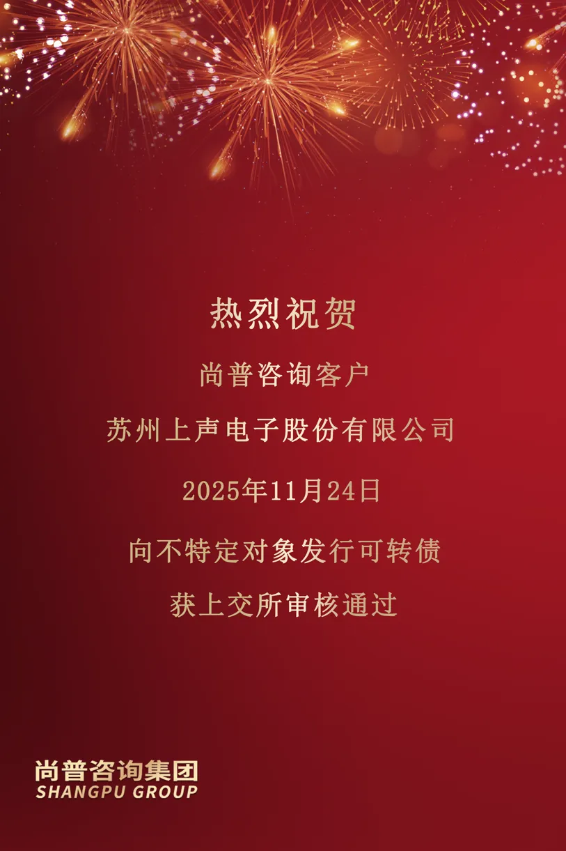 2025年11月24日,尚普咨询客户——苏州上声电子股份有限公司(证券简称:上声电子,证券代码:688533.SH)公开发行可转债通过上交所审核。